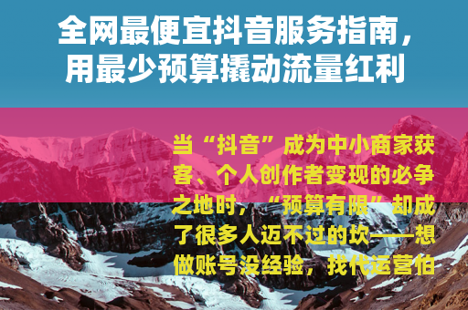 当“抖音”成为中小商家获客、个人创作者变现的必争之地时,“预算有限”却成了很多人迈不过的坎——想做账号没经验,找代运营怕太贵,学课程又担心性价比低,这时候,“全网最便宜抖音”相关服务就成了他们的关注点:如何用最少的钱,完成抖音从0到1的起步?