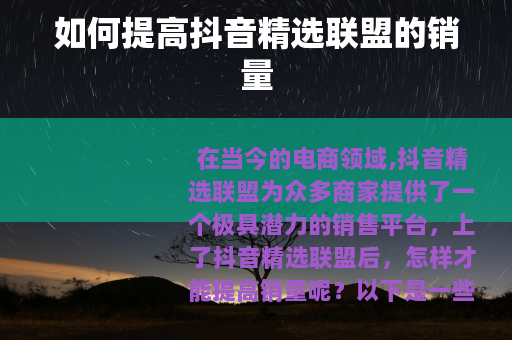 在当今的电商领域,抖音精选联盟为众多商家提供了一个极具潜力的销售平台,上了抖音精选联盟后,怎样才能提高销量呢?以下是一些有效的方法。
