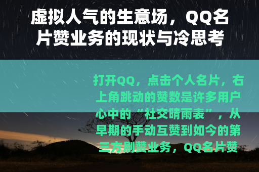 随着QQ官方监管的加强(如打击机器人账号、限制异常点赞行为),以及用户对真实社交的重视,名片赞业务的生存空间正在缩小,虚拟人气的生意场,终究是一场镜花水月——真正的“人气”,从来不是靠数字堆砌,而是靠真诚与温暖赢得。
