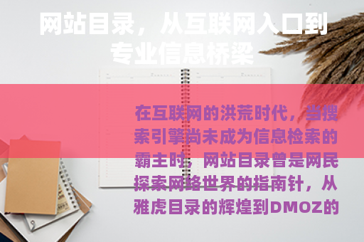 在互联网的洪荒时代,当搜索引擎尚未成为信息检索的霸主时,网站目录曾是网民探索网络世界的指南针,从雅虎目录的辉煌到DMOZ的落幕,网站目录的命运与互联网的发展紧密相连,虽然搜索引擎占据主导地位,但网站目录并未消失,而是以更精准、更专业的姿态,继续在网络生态中扮演着独特的角色。