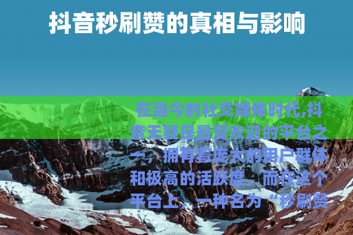 在当今的社交媒体时代,抖音无疑是最受欢迎的平台之一,拥有着庞大的用户群体和极高的活跃度,而在这个平台上,一种名为“秒刷赞抖音”的现象逐渐引起了人们的关注。