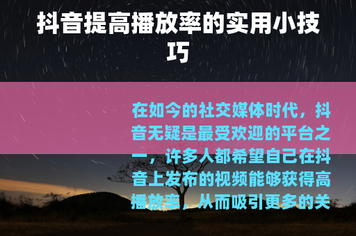 在如今的社交媒体时代,抖音无疑是最受欢迎的平台之一,许多人都希望自己在抖音上发布的视频能够获得高播放率,从而吸引更多的关注和粉丝,抖音提高播放率的小技巧有哪些呢?以下是一些实用的方法。 是关键,要确保你的视频内容具有吸引力和独特性,可以选择热门的话题,但要从一个新颖的角度去呈现,这样才能在众多同类视频中脱颖而出,如果你想制作美食类视频,不要只是简单地展示烹饪过程,你可以加入一些有趣的故事或独特的烹饪技巧分享,让观众在学习美食制作的同时,还能感受到乐趣。