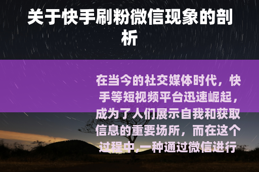 在当今的社交媒体时代,快手等短视频平台迅速崛起,成为了人们展示自我和获取信息的重要场所,而在这个过程中,一种通过微信进行快手刷粉的现象也悄然出现。