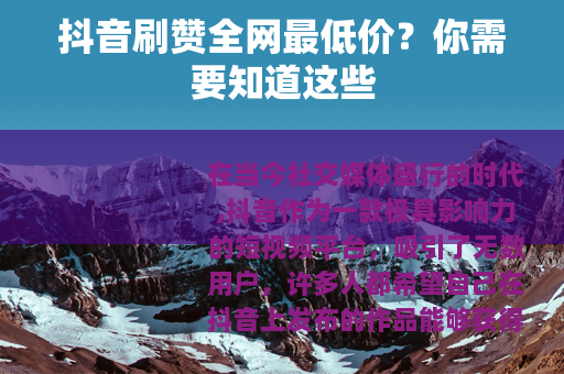 在当今社交媒体盛行的时代,抖音作为一款极具影响力的短视频平台,吸引了无数用户,许多人都希望自己在抖音上发布的作品能够获得更多的点赞,从而获得更多的关注和流量,市场上出现了各种各样声称能提供抖音刷赞服务且价格全网最低的商家。