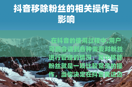 当你决定在抖音我这边移除粉丝时,需要了解一些相关的要点,移除粉丝的操作相对来说比较简单,你只需进入自己的粉丝列表,找到你想要移除的粉丝对应的选项,通常会有一个明确的移除按钮,点击即可完成移除操作。