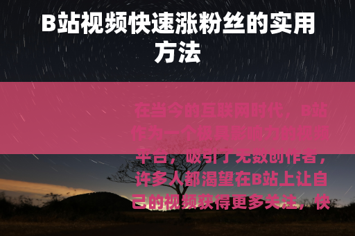 在当今的互联网时代,B站作为一个极具影响力的视频平台,吸引了无数创作者,许多人都渴望在B站上让自己的视频获得更多关注,快速涨粉丝,从而实现自己的创作价值和影响力,以下是一些关于B站视频如何快速涨粉丝的有效方法。 质量是关键,要制作出有创意、有趣、有深度的视频内容,深入了解你的目标受众,明确他们的兴趣和需求,然后根据这些来规划你的视频主题,如果你发现年轻群体对游戏攻略、动漫解析等内容比较感兴趣,那么你就可以在这些领域深耕,提供独特的见解和实用的技巧,让观众在观看你的视频后能有所收获,这样他们就更有可能关注你,成为你的粉丝。