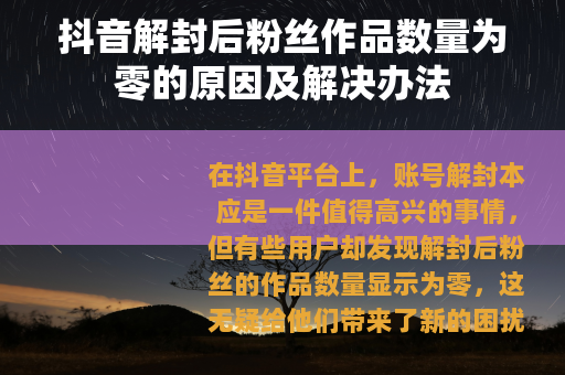 在抖音平台上,账号解封本应是一件值得高兴的事情,但有些用户却发现解封后粉丝的作品数量显示为零,这无疑给他们带来了新的困扰,我们就来深入探讨一下这一现象背后的原因以及相应的解决办法。