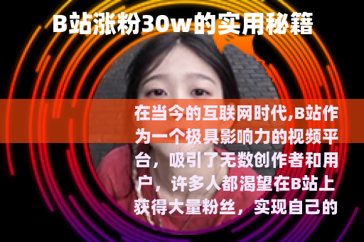 在当今的互联网时代,B站作为一个极具影响力的视频平台,吸引了无数创作者和用户,许多人都渴望在B站上获得大量粉丝,实现自己的创作价值和影响力,就来和大家分享一些能够帮助你在B站涨粉30w的有效方法。 质量是关键,要想吸引观众并让他们成为你的粉丝,你必须提供有价值、有趣、独特的视频内容,这意味着你需要深入了解你的目标受众,知道他们感兴趣的话题和类型,然后根据这些来策划和制作视频,无论是搞笑、知识科普、游戏攻略还是生活记录,只要你能在自己擅长的领域做到极致,就有机会获得大量粉丝的关注。