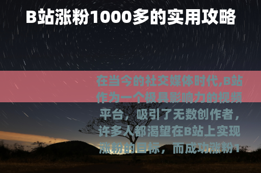 在当今的社交媒体时代,B站作为一个极具影响力的视频平台,吸引了无数创作者,许多人都渴望在B站上实现涨粉的目标,而成功涨粉1000多更是不少创作者的阶段性梦想,以下是一些能够帮助你在B站涨粉1000多的有效方法。 质量是关键,要确保你的视频内容有独特性和吸引力,无论是搞笑、知识科普、美食制作还是游戏攻略等各种类型,都要做到在同类题材中脱颖而出,精心策划视频的选题,深入挖掘用户感兴趣的点,用新颖的视角和表达方式呈现出来,如果你擅长美食制作,可以尝试结合当下流行的健康饮食趋势,制作出既美味又营养的特色食谱视频,这样能更容易吸引观众的关注。