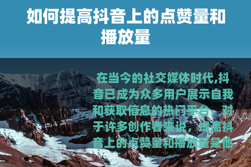在当今的社交媒体时代,抖音已成为众多用户展示自我和获取信息的热门平台,对于许多创作者来说,提高抖音上的点赞量和播放量是他们努力追求的目标,究竟有哪些方法可以帮助我们实现这一目标呢? 质量是关键,要制作出吸引人的视频内容,需要关注当下的热点话题和用户兴趣点,了解目标受众的喜好,创作出能够引起他们共鸣的视频,可以通过讲述有趣的故事、分享实用的知识或展示独特的才艺等方式,吸引用户的关注并让他们产生兴趣,确保视频的画面清晰、音质良好,剪辑流畅,给用户带来良好的观看体验。