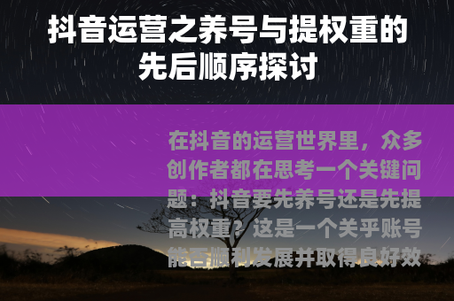 在抖音的运营世界里,众多创作者都在思考一个关键问题:抖音要先养号还是先提高权重?这是一个关乎账号能否顺利发展并取得良好效果的重要抉择。
