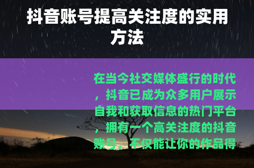 在当今社交媒体盛行的时代,抖音已成为众多用户展示自我和获取信息的热门平台,拥有一个高关注度的抖音账号,不仅能让你的作品得到更广泛的传播,还能为你带来更多的机会和乐趣,抖音账号怎么提高关注度呢?以下是一些实用的方法。