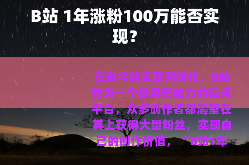 在当今的互联网时代,B站作为一个极具影响力的视频平台,众多创作者都渴望在其上获得大量粉丝,实现自己的创作价值。“B站1年涨粉100万”这样的话题备受关注,大家都想知道这到底是真的吗?