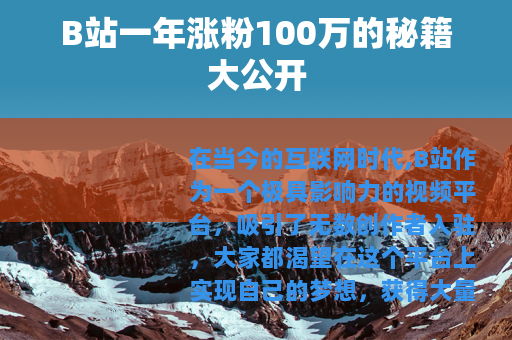 在当今的互联网时代,B站作为一个极具影响力的视频平台,吸引了无数创作者入驻,大家都渴望在这个平台上实现自己的梦想,获得大量的粉丝,如何在B站一年涨粉100万呢?以下是一些实用的方法。 质量是关键,要制作出高质量、有创意且独特的视频内容,深入了解你的目标受众,知道他们感兴趣的话题和喜好,然后根据这些来策划你的视频主题,无论是搞笑、知识科普、美食制作还是游戏攻略等,只要你能在自己擅长的领域提供有价值的内容,就能吸引到粉丝的关注,如果你擅长绘画,可以制作一系列绘画教程视频,从基础的绘画技巧到高级的创作思路,详细地分享给观众,让他们能从中受益,这样自然会有更多人愿意关注你。
