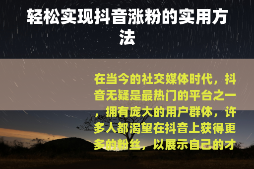 在当今的社交媒体时代,抖音无疑是最热门的平台之一,拥有庞大的用户群体,许多人都渴望在抖音上获得更多的粉丝,以展示自己的才华、分享生活点滴或推广自己的产品与服务,如何才能简单地实现抖音涨粉呢?