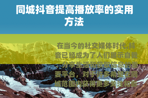 在当今的社交媒体时代,抖音已经成为了人们展示自我、分享生活和获取信息的重要平台,对于许多希望在同城范围内获得更多关注和影响力的用户来说,提高同城抖音的播放率是一个关键目标,以下是一些有效的方法,可以帮助你实现这一目标。