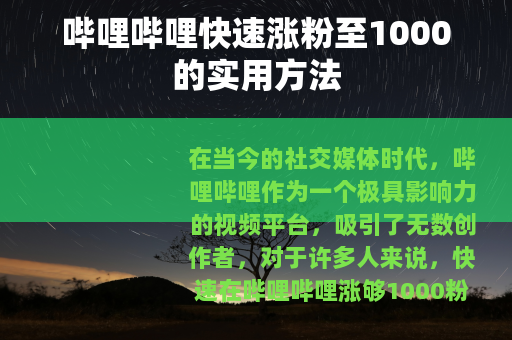 在当今的社交媒体时代,哔哩哔哩作为一个极具影响力的视频平台,吸引了无数创作者,对于许多人来说,快速在哔哩哔哩涨够1000粉是一个重要的目标,它不仅能带来更多的关注和认可,还能开启更多的创作机会,以下是一些在哔哩哔哩快速涨粉至1000的有效方法。