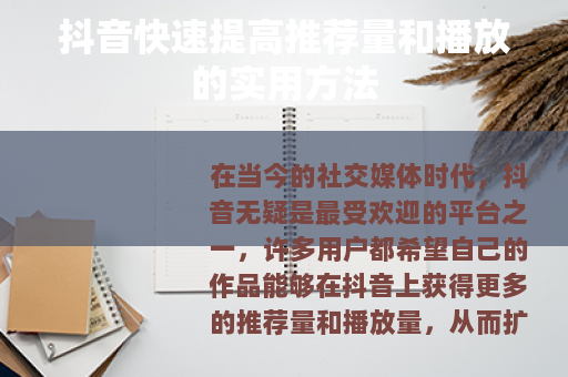 在当今的社交媒体时代,抖音无疑是最受欢迎的平台之一,许多用户都希望自己的作品能够在抖音上获得更多的推荐量和播放量,从而扩大自己的影响力和知名度,抖音怎么快速提高推荐量和播放呢?以下是一些实用的方法。 质量是关键,要确保你的视频内容具有独特性、趣味性和实用性,独特的内容能够吸引用户的注意力,让他们在众多视频中选择观看你的作品,趣味性则可以让用户在观看过程中感到愉悦,增加他们分享和点赞的可能性,而实用性的内容,如知识分享、技能教学等,往往更容易被用户收藏和反复观看。