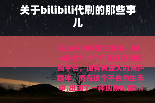 bilibili代刷指的是通过一些非官方渠道的手段,来帮助用户提升在bilibili上的各种数据,比如视频的播放量、点赞数、评论数、弹幕数等等,一些用户可能会被这种代刷服务所吸引,认为通过代刷可以让自己的作品更容易被关注到,从而获得更多的流量和曝光。