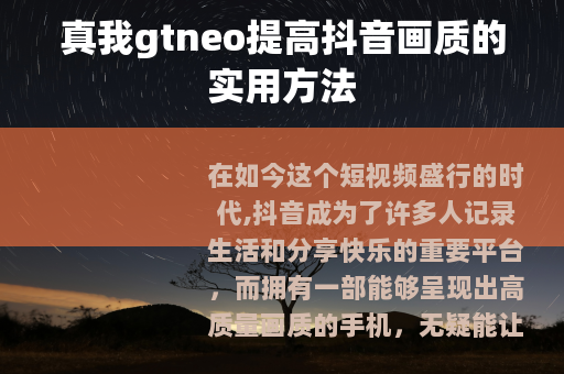 在如今这个短视频盛行的时代,抖音成为了许多人记录生活和分享快乐的重要平台,而拥有一部能够呈现出高质量画质的手机,无疑能让我们在抖音上的创作和观看体验更上一层楼,真我gtneo作为一款备受欢迎的智能手机,在提高抖音画质方面有着独特的优势和一些实用的方法。