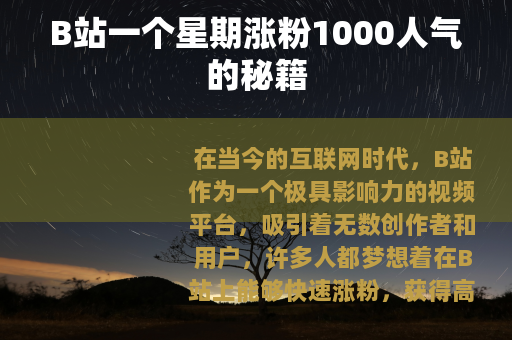 在当今的互联网时代,B站作为一个极具影响力的视频平台,吸引着无数创作者和用户,许多人都梦想着在B站上能够快速涨粉,获得高人气,我们就来聊聊如何在B站实现一个星期涨粉1000人气的方法。 质量是关键,要创作出有吸引力、有价值的视频内容,了解你的目标受众,知道他们感兴趣的话题和喜好,针对性地制作视频,这样才能更容易引起他们的关注和共鸣,如果你面向的是年轻的游戏爱好者群体,那么制作精彩的游戏攻略、搞笑的游戏实况等视频,就会有很大的市场。