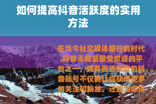 在当今社交媒体盛行的时代,抖音无疑是最受欢迎的平台之一,拥有高活跃度的抖音账号不仅能让你获得更多的关注和粉丝,还能为你带来更多的乐趣和机会,如何提高抖音活跃度呢?以下是一些实用的方法。
