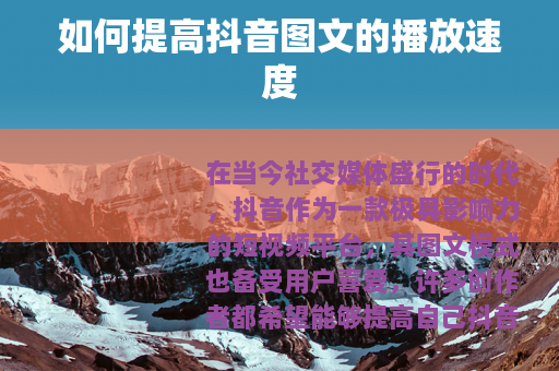 在当今社交媒体盛行的时代,抖音作为一款极具影响力的短视频平台,其图文模式也备受用户喜爱,许多创作者都希望能够提高自己抖音图文的播放速度,从而获得更多的关注和流量,以下是一些可以帮助你提高抖音图文播放速度的有效方法。