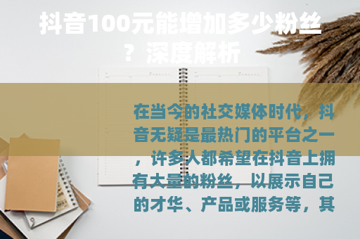 在当今的社交媒体时代,抖音无疑是最热门的平台之一,许多人都希望在抖音上拥有大量的粉丝,以展示自己的才华、产品或服务等,其中一个备受关注的问题就是,在抖音上花费100元究竟可以增加多少粉丝呢?