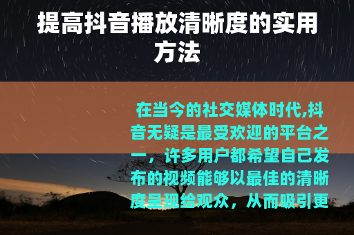 在当今的社交媒体时代,抖音无疑是最受欢迎的平台之一,许多用户都希望自己发布的视频能够以最佳的清晰度呈现给观众,从而吸引更多的关注和点赞,抖音播放清晰度怎么提高呢?以下是一些有效的方法。