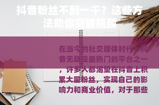 在当今的社交媒体时代,抖音无疑是最热门的平台之一,许多人都渴望在抖音上积累大量粉丝,实现自己的影响力和商业价值,对于那些抖音粉丝还不到一千的用户来说,可能会感到有些迷茫和困惑,别担心,本文将为你提供一些实用的方法,帮助你突破这个瓶颈,让你的抖音之路越走越顺。