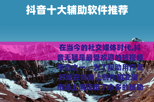 在当今的社交媒体时代,抖音无疑是最受欢迎的短视频平台之一,为了帮助用户更好地在抖音上创作和发展,市场上涌现出了众多的辅助软件,以下是备受关注的抖音十大辅助软件。