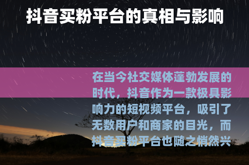 在当今社交媒体蓬勃发展的时代,抖音作为一款极具影响力的短视频平台,吸引了无数用户和商家的目光,而抖音买粉平台也随之悄然兴起,成为了一个备受关注的话题。