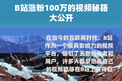 在当今的互联网时代,B站作为一个极具影响力的视频平台,吸引了无数创作者和用户,许多人都梦想着自己的视频能够在B站上获得巨大的关注,涨粉100万更是众多创作者的终极目标之一,如何才能制作出这样的爆款视频,实现涨粉100万的梦想呢? 是关键,一个能够吸引大量观众的视频,必须要有独特而有趣的内容,创作者需要深入了解自己的目标受众,知道他们感兴趣的话题和喜好,如果你面向的是年轻的游戏爱好者,那么制作精彩的游戏攻略、搞笑的游戏实况或者深度的游戏评测视频,就有可能引起他们的共鸣,要注重内容的创新性,避免千篇一律的跟风之作,在众多同类视频中脱颖而出,才能让观众眼前一亮,从而吸引他们关注你的账号。