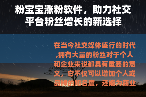 粉宝宝涨粉软件为广大社交媒体用户提供了一个全新的、有效的粉丝增长解决方案,它以其智能、高效、安全的特点,受到了越来越多用户的青睐,如果你也希望在社交平台上拥有更多的粉丝,不妨试试粉宝宝涨粉软件,让你的社交之旅更加精彩。