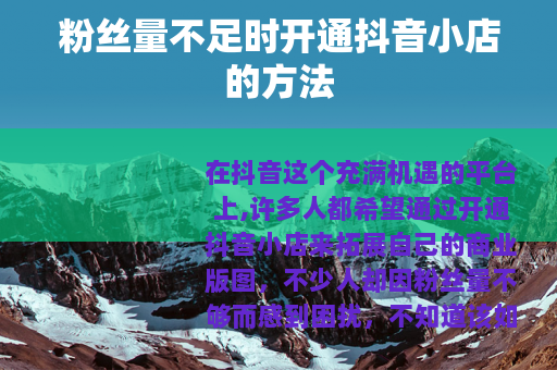 在抖音这个充满机遇的平台上,许多人都希望通过开通抖音小店来拓展自己的商业版图,不少人却因粉丝量不够而感到困扰,不知道该如何突破这一限制开通小店,我们就来详细探讨一下粉丝量不够怎么开通抖音小店的问题。