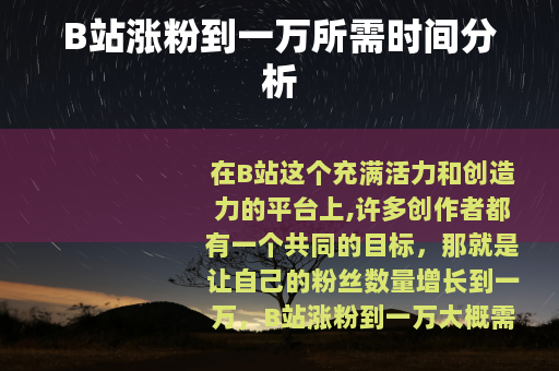 在B站这个充满活力和创造力的平台上,许多创作者都有一个共同的目标,那就是让自己的粉丝数量增长到一万,B站涨粉到一万大概需要多久呢?这其实并没有一个固定的答案,因为它受到多种因素的影响。 的质量是至关重要的,如果你的视频内容新颖、有趣、有深度,能够吸引观众的眼球并让他们产生共鸣,那么就更容易获得关注和粉丝,一些知识类博主通过制作高质量的科普视频,深入浅出地讲解专业知识,吸引了大量对学习新知识有兴趣的用户,从而实现了粉丝的快速增长。
