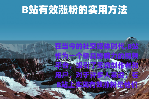 在当今的社交媒体时代,B站作为一个极具影响力的视频平台,吸引了无数创作者和用户,对于许多人来说,在B站上实现有效涨粉是他们努力的目标,如何在B站上有效地涨粉呢?以下是一些实用的方法。 质量是关键,要制作出高质量、有吸引力的视频内容,这意味着要在选题上多下功夫,选择那些能够引起观众兴趣和共鸣的话题,可以关注当下的热点事件、流行趋势,或者是一些具有独特性和专业性的领域,在制作过程中,要注重视频的画面质量、剪辑技巧和音频效果,确保给观众带来良好的观看体验。
