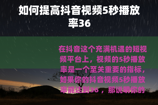 在抖音这个充满机遇的短视频平台上,视频的5秒播放率是一个至关重要的指标,如果你的抖音视频5秒播放率能达到36 ,那说明你的视频已经具备了一定的吸引力,但仍有提升的空间,以下是一些可以帮助你提高抖音视频5秒播放率的有效方法。
