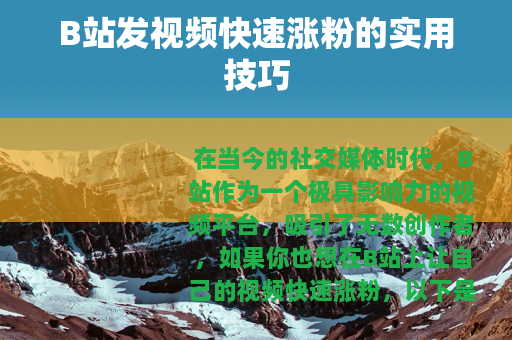 在当今的社交媒体时代,B站作为一个极具影响力的视频平台,吸引了无数创作者,如果你也想在B站上让自己的视频快速涨粉,以下是一些实用的技巧。 是关键,要确保你的视频内容有足够的吸引力和独特性,深入了解你的目标受众,知道他们感兴趣的话题是什么,然后围绕这些话题创作高质量的视频,如果你发现游戏攻略类视频在B站很受欢迎,而你又擅长某款游戏,那么就可以制作详细且易懂的游戏攻略视频,为玩家提供真正有价值的帮助。