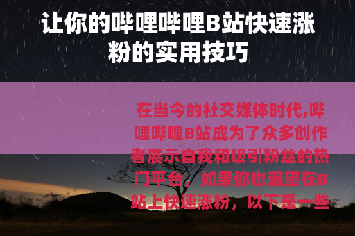 在当今的社交媒体时代,哔哩哔哩B站成为了众多创作者展示自我和吸引粉丝的热门平台,如果你也渴望在B站上快速涨粉,以下是一些实用的方法可以帮助你实现这一目标。 质量是关键,要确保你制作的视频具有独特性和吸引力,深入了解你的目标受众,挖掘他们感兴趣的话题,然后用新颖的方式呈现出来,无论是有趣的动画、精彩的游戏解说、专业的知识分享还是感人的生活故事,都要在内容上做到精益求精,让观众在观看你的视频后能获得有价值的体验,从而愿意关注你并持续观看你的后续作品。