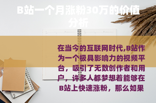 在当今的互联网时代,B站作为一个极具影响力的视频平台,吸引了无数创作者和用户,许多人都梦想着能够在B站上快速涨粉,那么如果一个账号在一个月内涨粉30万,这背后有着怎样的价值呢?