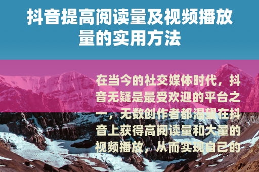 在当今的社交媒体时代,抖音无疑是最受欢迎的平台之一,无数创作者都渴望在抖音上获得高阅读量和大量的视频播放,从而实现自己的价值和目标,究竟有哪些方法可以帮助我们在抖音上提高阅读量和视频播放量呢? 的质量至关重要,一个吸引人的视频内容能够迅速抓住用户的眼球,让他们产生继续观看的欲望,这就需要我们在创作时,深入了解目标受众的兴趣和需求,制作出符合他们口味的视频,如果你的目标受众是年轻人,那么可以选择一些时尚、潮流、娱乐等热门话题进行创作,同时要确保视频具有趣味性、实用性或情感共鸣点,这样才能让用户在观看后有所收获,进而愿意分享给更多的人。
