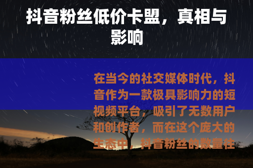在当今的社交媒体时代,抖音作为一款极具影响力的短视频平台,吸引了无数用户和创作者,而在这个庞大的生态中,抖音粉丝的数量往往被视为衡量一个账号影响力和价值的重要指标之一,抖音粉丝低价卡盟应运而生。