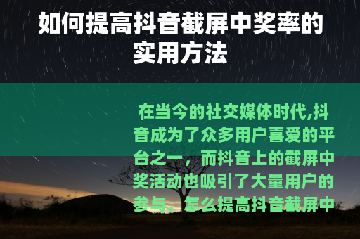 在当今的社交媒体时代,抖音成为了众多用户喜爱的平台之一,而抖音上的截屏中奖活动也吸引了大量用户的参与,怎么提高抖音截屏中奖率呢?以下是一些实用的方法。