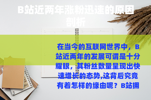 在当今的互联网世界中,B站近两年的发展可谓是十分耀眼,其粉丝数量呈现出快速增长的态势,这背后究竟有着怎样的缘由呢?