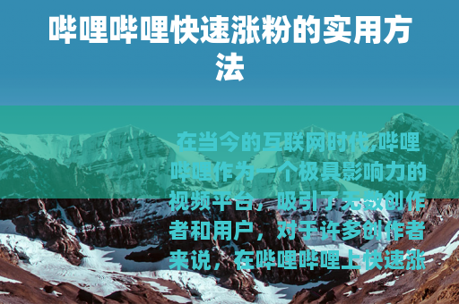 在当今的互联网时代,哔哩哔哩作为一个极具影响力的视频平台,吸引了无数创作者和用户,对于许多创作者来说,在哔哩哔哩上快速涨粉是他们努力追求的目标,以下是一些可以帮助你在哔哩哔哩快速涨粉的方法。 质量是关键,要确保你的视频内容有深度、有趣味、有价值,无论是知识科普、娱乐搞笑还是生活记录,都要做到精益求精,让观众在观看你的视频后能有所收获,这样他们才会更愿意关注你,成为你的粉丝,如果你擅长游戏解说,可以通过独特的视角、精彩的操作和幽默的语言来吸引游戏爱好者;如果你是美食博主,可以分享独特的食谱、详细的制作过程以及有趣的美食故事,满足观众对美食的好奇和热爱。