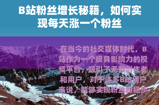 要在B站实现每天涨一个粉丝并非一蹴而就的事情,需要持续不断地努力和优化,但只要你坚持提供优质的内容,保持良好的互动,合理运用平台的功能,相信你一定能够逐步实现粉丝的增长,在B站这个充满活力的平台上收获属于自己的成功。