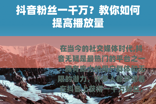 在当今的社交媒体时代,抖音无疑是最热门的平台之一,拥有庞大的用户群体和无限的潜力,许多人都梦想着在抖音上获得一千万粉丝,实现自己的影响力和价值,如何提高抖音的播放量,从而一步步向一千万粉丝的目标迈进呢? 是关键,要确保你的视频内容具有吸引力和独特性,可以从自己的兴趣、特长或专业领域出发,创作一些能够引起观众共鸣的视频,如果你擅长烹饪,那么可以制作各种美味菜肴的制作过程视频,分享一些烹饪技巧和心得,这样的内容不仅能够吸引美食爱好者,还能让观众在观看过程中学到东西,增加视频的价值。