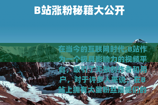 在当今的互联网时代,B站作为一个极具影响力的视频平台,吸引了无数创作者和用户,对于许多人来说,在B站上拥有大量粉丝是他们的梦想,那么B站怎样涨粉丝呢?下面就为大家详细介绍一些有效的方法。 质量是关键,要制作出优质、有吸引力的视频内容,这意味着你需要有独特的创意和观点,能够在众多视频中脱颖而出,无论是搞笑、知识科普、美食制作还是游戏攻略等各种类型,都要确保你的视频有足够的亮点,让观众在观看后能有所收获或感到愉悦,从而愿意关注你,期待你的下一个作品。
