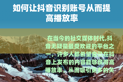 在当今的社交媒体时代,抖音无疑是最受欢迎的平台之一,许多人都希望自己在抖音上发布的内容能够获得高播放率,从而吸引更多的关注和粉丝,怎么让抖音识别账号提高播放率呢?以下是一些实用的方法。